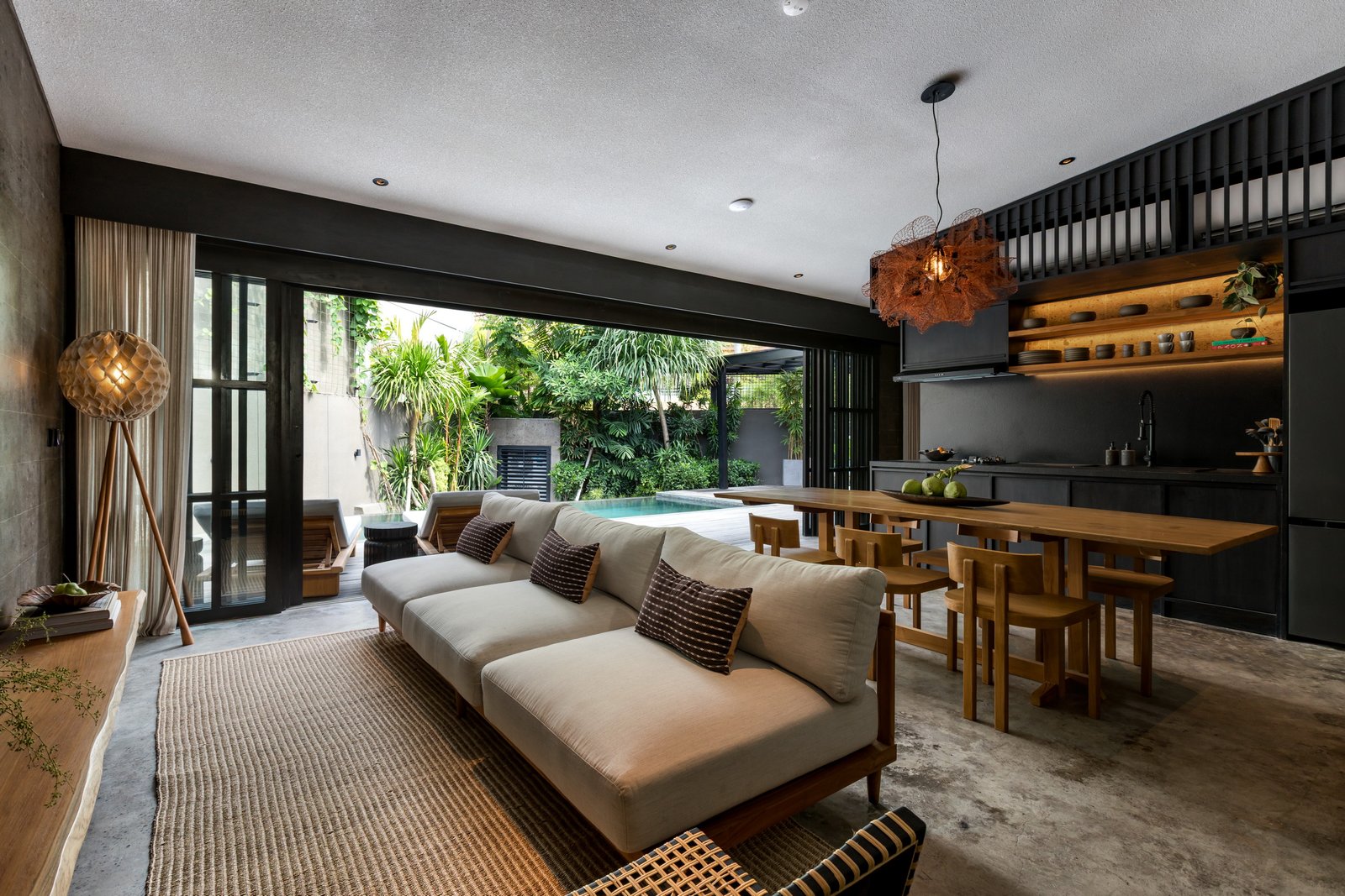 Your favorite corner to relax, read, or just feel at home. The living room feels open yet intimate, with high ceilings, natural textures, and soft seating. Neutral tones and minimal design make it easy to settle in — whether you’re stretched out on the sofa with a book or catching up over drinks. Large doors open up to the poolside deck, connecting the indoors with the lush garden outside.